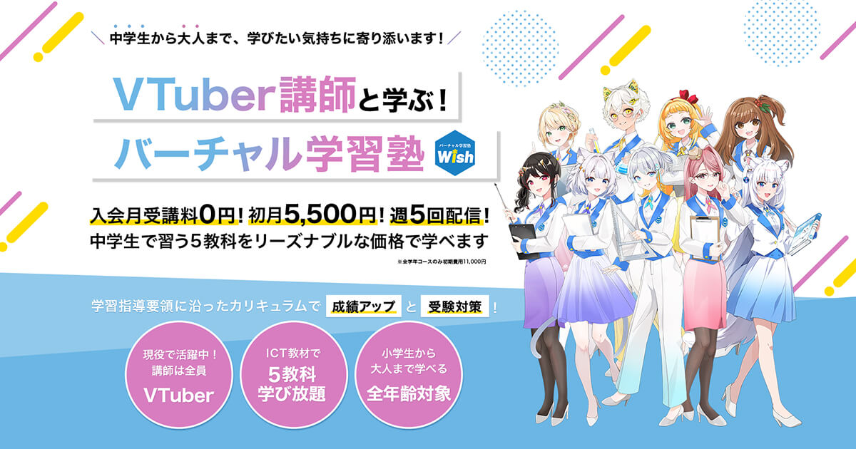 現役VTuberが講師の「バーチャル学習塾Wish」が開校 中学生5教科を動画配信、大人も受講可能 宇推くりあ、きら子等7名が参加