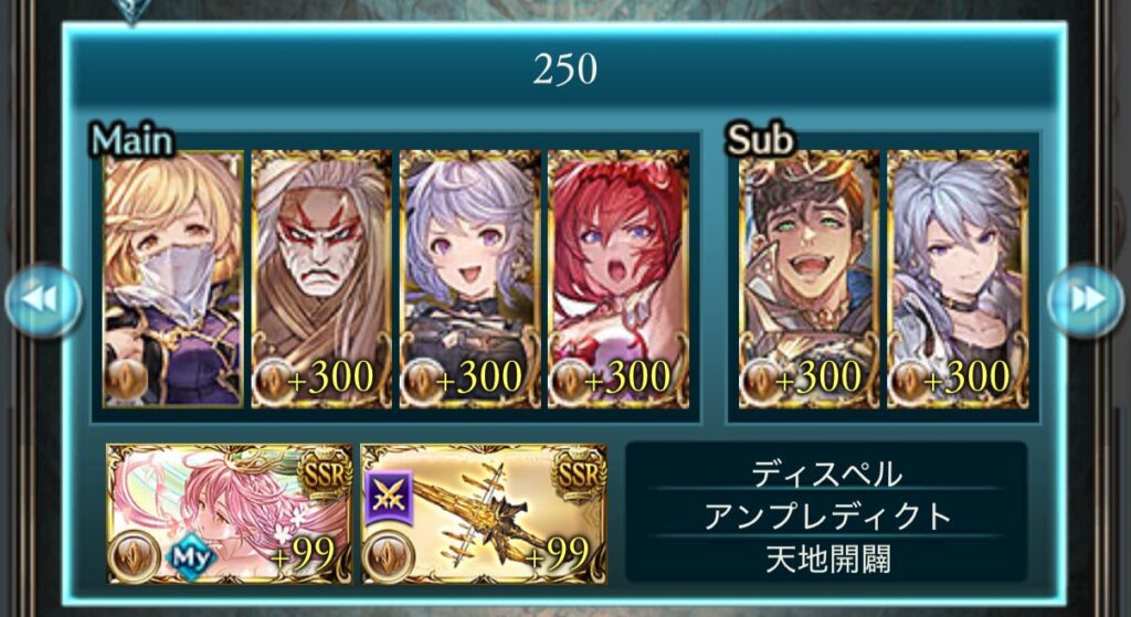 250HLの編成は200HLの編成とほぼ同じですね。EX編成になって装備の枠が増えた分いくつか装備を増やした程度で、キャラなんかは全く一緒です。なんだかんだこの編成が安定していたんでしょうね。完全フルオートで完走できたかどうかは覚えてませんが。