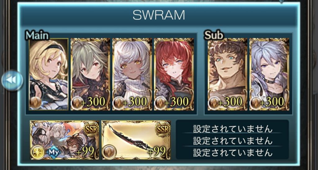 SWARMは上記の編成で周回していました。なんかEX+の編成とほぼ同じですね。違う点は終末が誘惑から虚詐に変わったことくらいでしょうか。